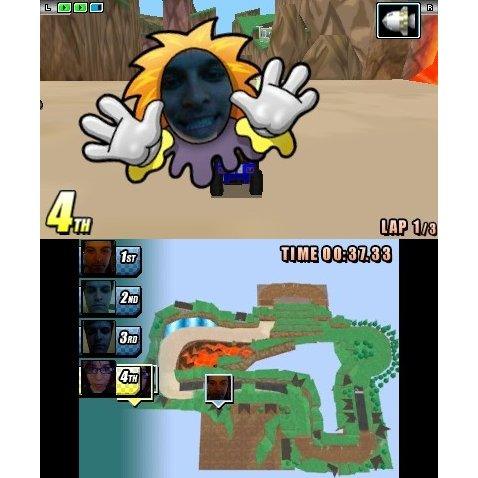 Start your turbo-charged engines and blast into the outrageous arcade racing game, Face Racers: Photo Finish, with photo customizable 3D racers that put YOU in the game! Available on the Nindendo 3DS, Face Racers delivers unique, in-your-face gameplay with dangerous obstacles that come to life in 3D right before your eyes! Take photos with your 3DS camera and place them on the face of your custom 3D racer, billboards, and power-ups. Take on friends in multiplayer mode for a true photo finish!