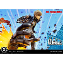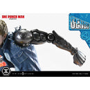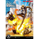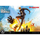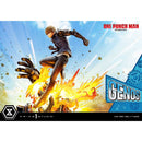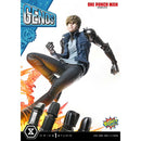 Genos' sculpt is intricately detailed, from the sculpted volume of his short hair to the rugged texture of his denim jacket and the solid metallic sheen of his cybernetic arms. His lean yet powerful physique is expressed with meticulous sculpting and paintwork, capturing every nuance of his form. Every element has been carefully crafted from the direction of his piercing yellow pupils to the powerful contours of his thighs as they tense mid-leap.