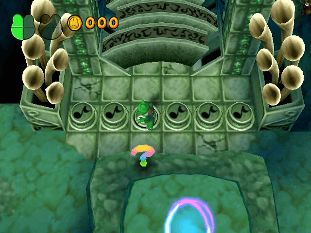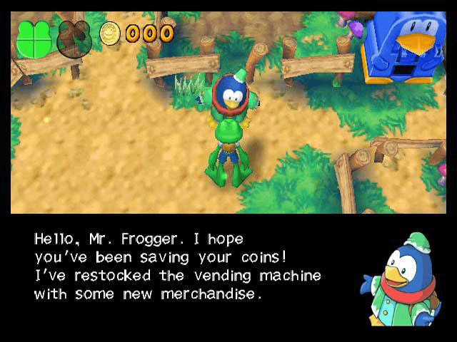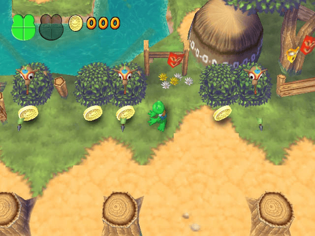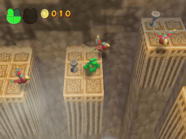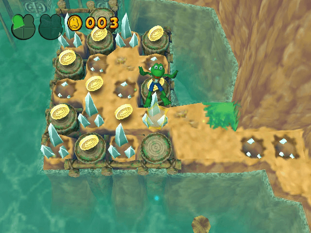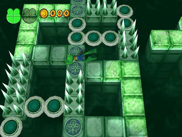 Frogger: Ancient Shadow finds Frogger hopping around small obstacle-filled environments with the main purpose of getting from point A to B, and collecting coins and health power-ups along the way. Most of the puzzles involve some feat of obstacle jumping (traps, platforms, water hazards), or enemy avoidance through hopping – but a few offer a some interesting uses for Frogger’s sticky tongue, which is employed for a number of unique tasks - from flipping switches, to retrieving objects, to swinging across obstacles.