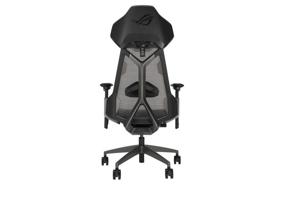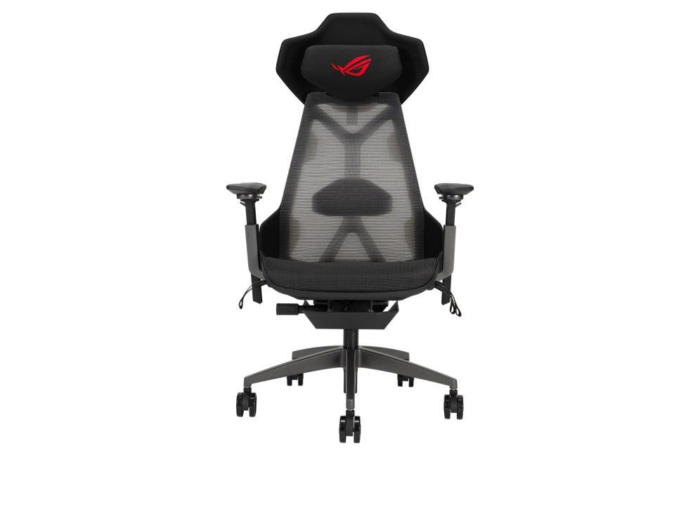 ROG Destrier Ergo Gaming Chair with futuristic cyborg aesthetic, versatile seat adjustments for the perfect posture, mobile gaming arm support mode, and acoustic panel for less distraction and more immersive gaming experience.