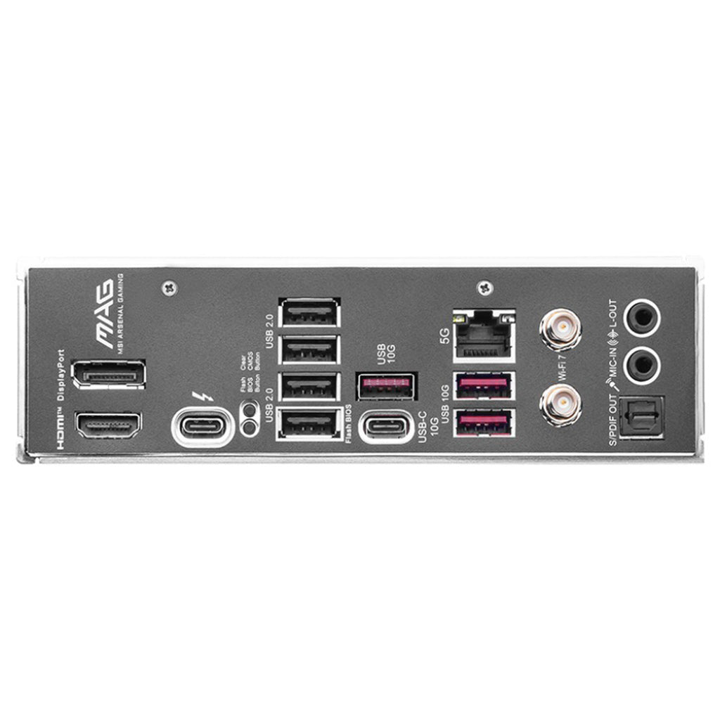 Back Panel Ports | DisplayPort, HDMI™, Thunderbolt™ 4 (USB-C), USB 10Gbps (Type-A & C), USB 2.0, 5G LAN, Wi-Fi/Bluetooth antenna, Audio connectors, S/PDIF Out, Flash BIOS Button, Clear CMOS Button |
