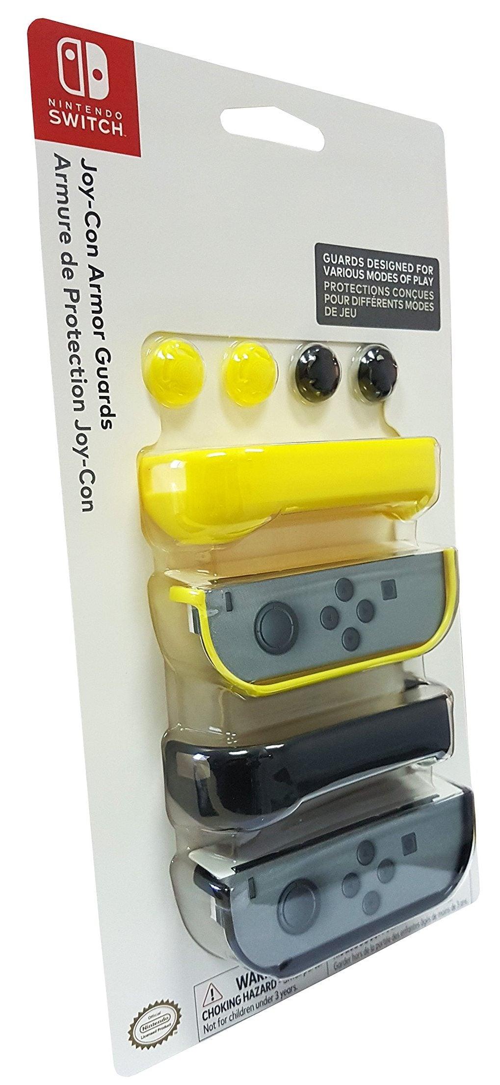The Nintendo Switch Joy-Con Armor Guards, officially licensed by Nintendo, have a patent-pending design for use in various modes of play and include 2 sets of Joy-Con Guards and 2 sets of thumb stick caps. This protective armor with a sleek ergonomic design securely attaches to the Joy-Con controllers and will prevent wear & tear and enhance your grip.