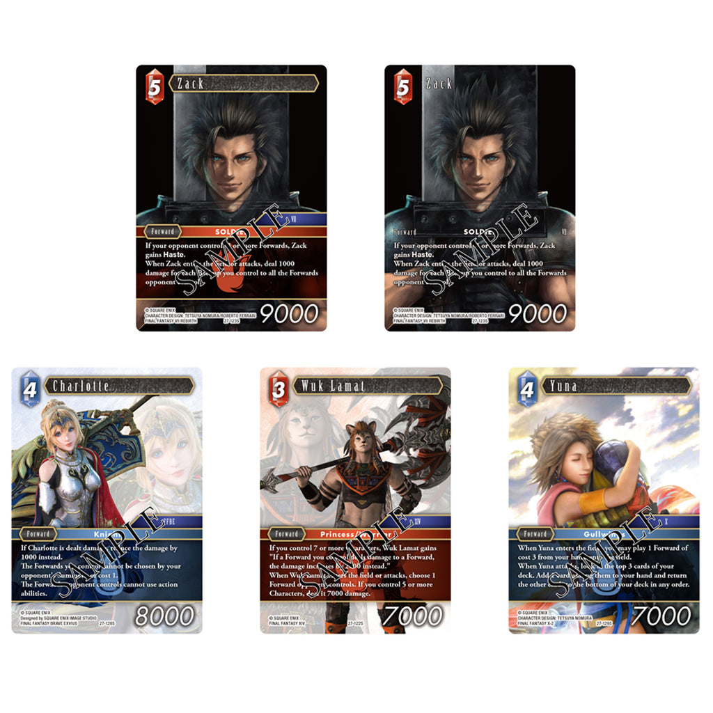 Vol. 1 contains a total of 58 cards consisting of 50 main deck cards and 8 LB (Limit Break) deck cards. Each deck includes 3 copies of each of the 4 types of Starter exclusive cards. Among these cards, Zack [27-123S] card is a full art premium card.