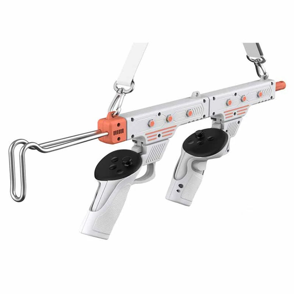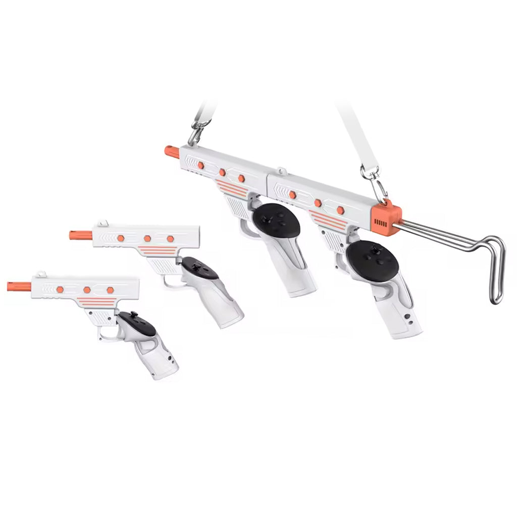 The Dual-Mode VR gun accessory is designed to elevate your gameplay with a flexible setup that easily transforms from a full-length rifle into two independent handguns, adapting seamlessly to different combat scenarios. Its optimized trigger and stock design enhance precision and control, ensuring improved shooting accuracy and responsiveness in every match. With a tactical, real-world firearm aesthetic, it delivers an immersive visual appeal that draws you deeper into the action. Custom clips provide a precise and secure fit for Meta Quest 3/3S controllers, maintaining stability even during intense, fast-paced battles. Altogether, this accessory creates a highly engaging and realistic VR shooting experience, making every session more exciting and dynamic.