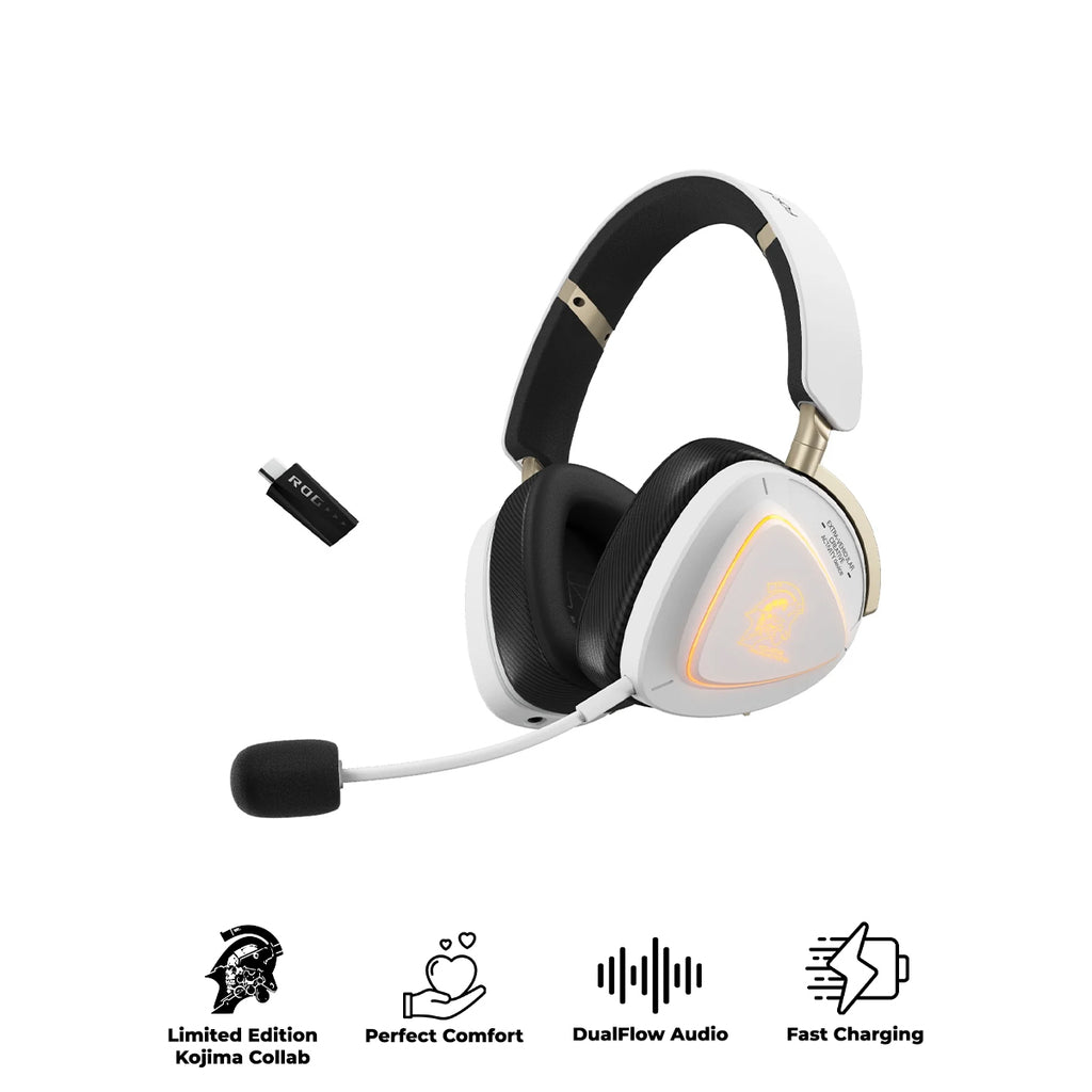 Tri-mode wireless gaming headset with ROG SpeedNova, 50 mm titanium-plated diaphragm drivers, and refined wireless sound signature, 10 mm super-wideband boom microphone, DualFlow Audio, up to 110-hour battery life, lightweight 318-g design, plus ASUS Aura Sync RGB lighting