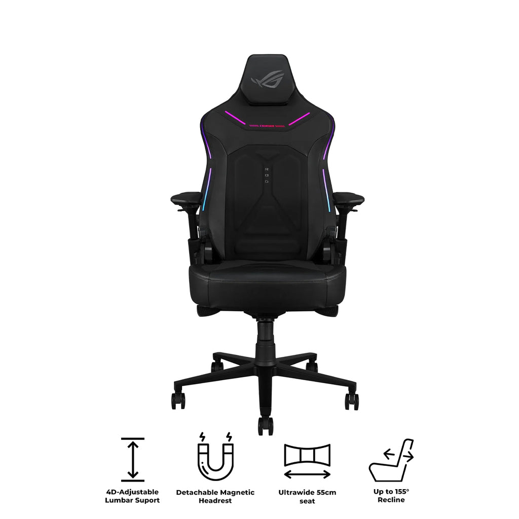 ROG Courser Gaming Chair ROG Courser gaming chair with adjustable cold-pressed lumbar pad for support and airflow, 4D armrests, ultrawide seat, magnetic headrest, dynamic synchronized recline system, and Aura RGB lighting ROG Dynamic Synchronized Recline system: Ensures the user’s spine is in ...