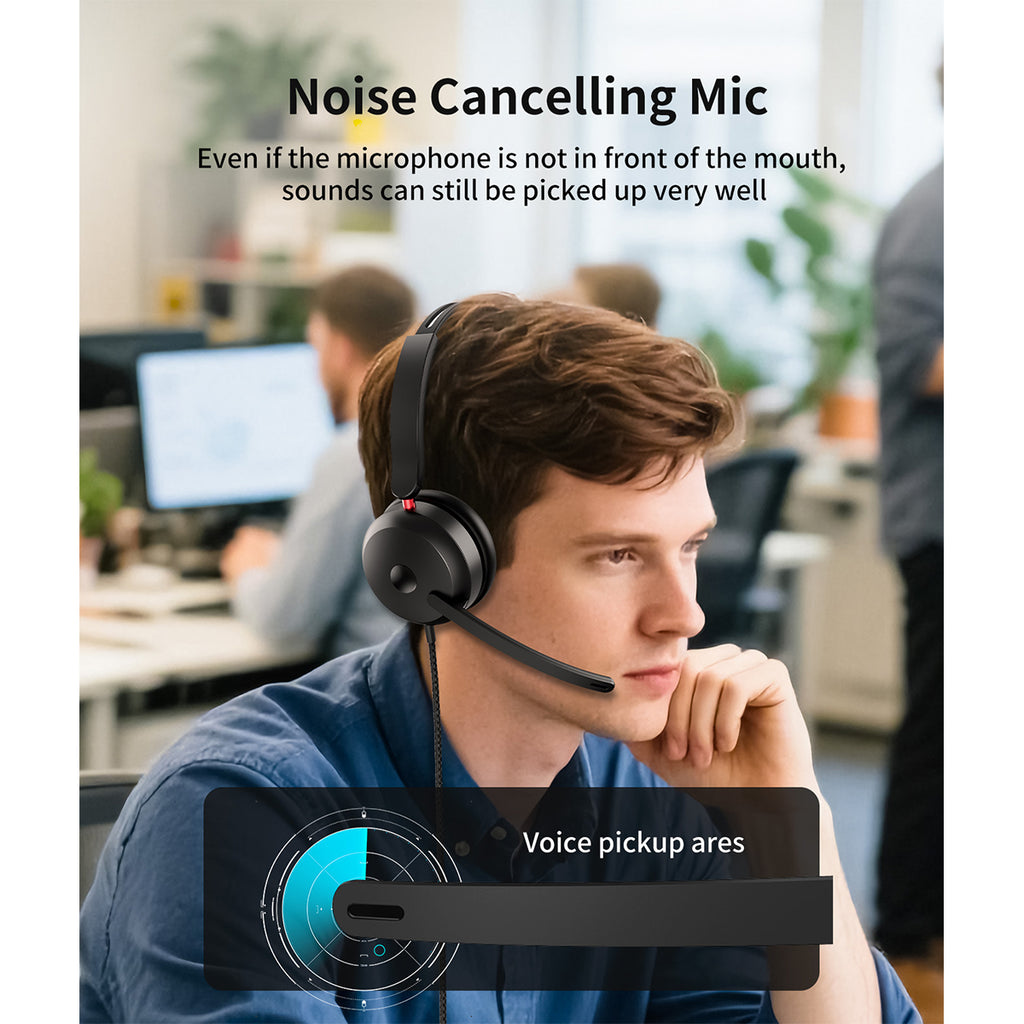 Easily connect to almost any device — PC, Laptop, MacBook, Smartphone, and more. Enjoy HD-quality sound with clear audio. The headset is ergonomically designed with an adjustable headband to fit the user's head. The earcups rotate up to 20° for added comfort, and the microphone rotates 270° with excellent noise cancellation capabilities.