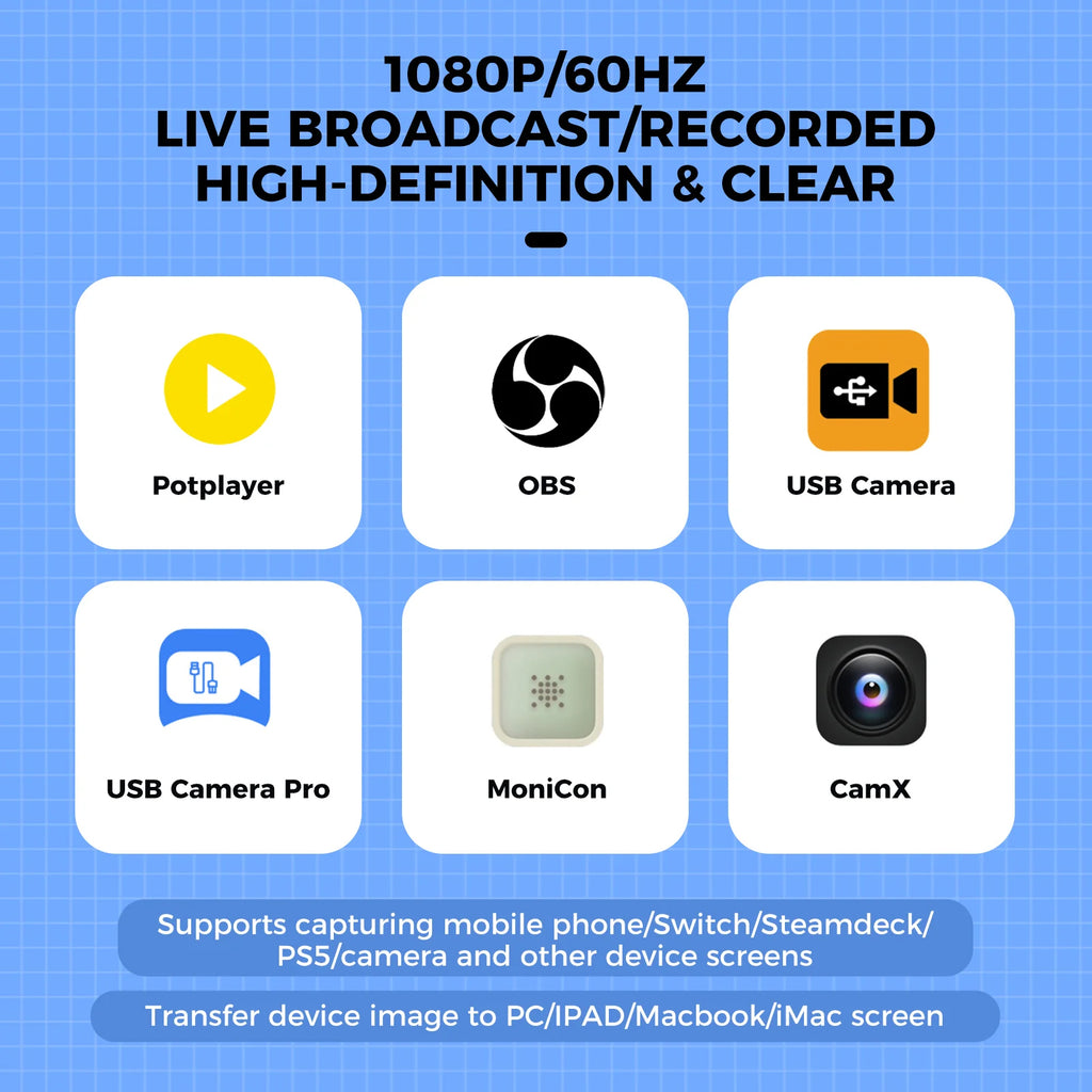 IINE Capture Card for Switch/Steam Deck/PS5/Camera/Live Broadcast/Recorded is a versatile external video capture device designed to enable gameplay capture, live streaming, and recording from a variety of HDMI‑equipped sources. It supports use with the Nintendo Switch, Steam Deck, PlayStation 5, cameras, and other HDMI output devices, making it suitable for content creators, streamers, and gamers alike. The plug‑and‑play design allows you to connect your console or camera to a PC or laptop without additional drivers, simplifying setup for streaming or recording sessions. This capture card provides a practical, affordable solution for broadcasting gameplay live or capturing high‑quality video for later editing and sharing across platforms