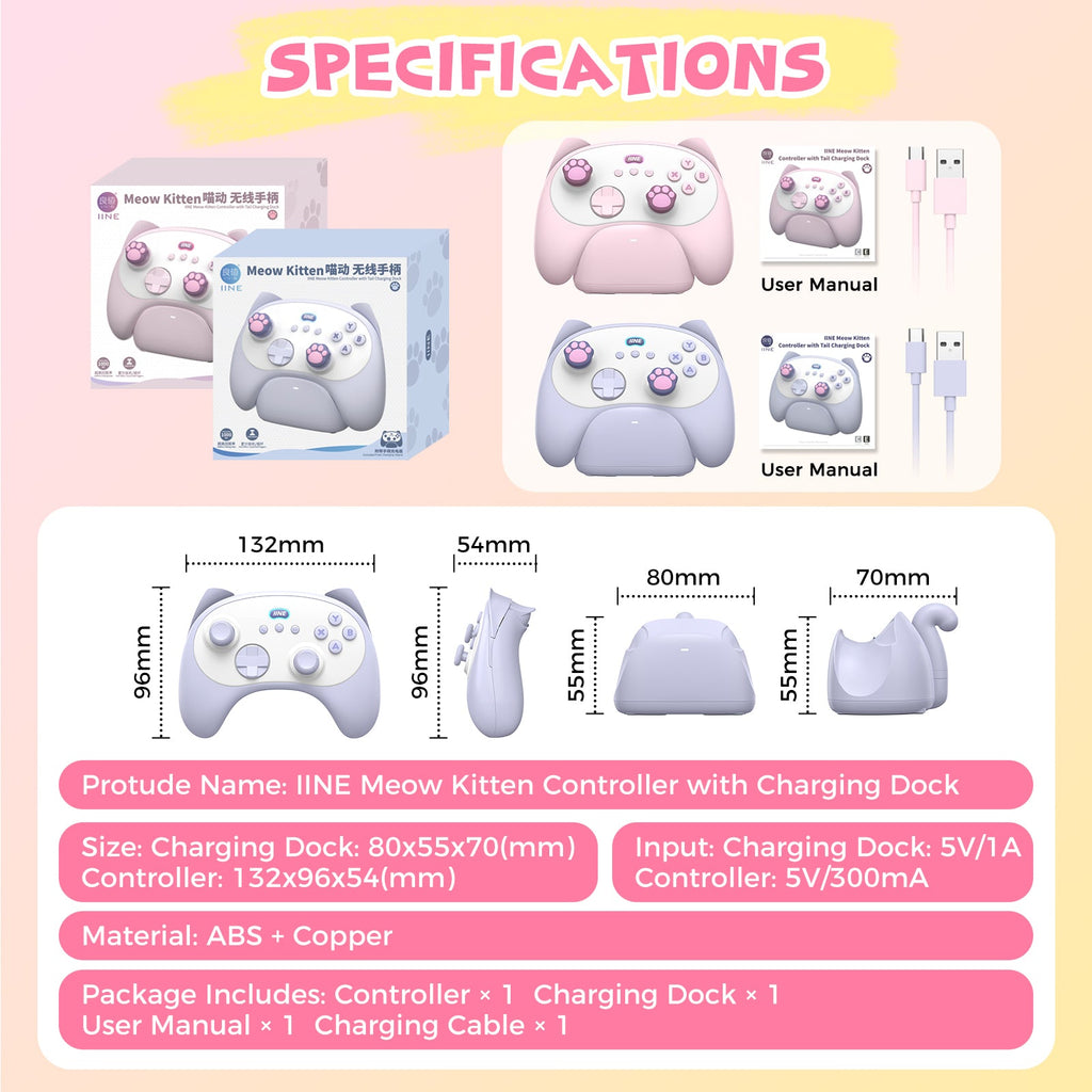 IINE Meow Kitten Controller with Tail Charging Dock for PC / Nintendo Switch (Blue, Pink) (L1049, L1050)