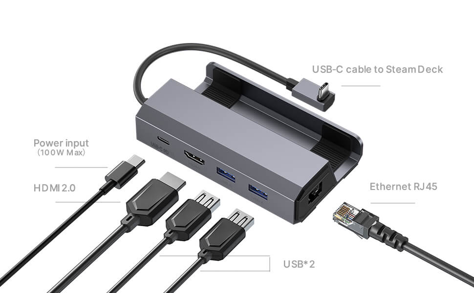 - 5-in-1 Docking Station for Steam Deck and ROG Ally: Features 4K@60Hz HDMI output, 100 Mbps RJ45/Ethernet input, USB-C charging, and dual USB-A 2.0 ports.