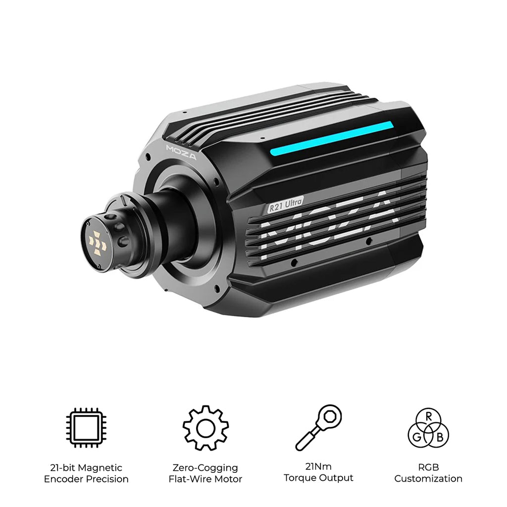 Experience professional-grade sim racing with the MOZA R21 Ultra DD Wheel Base. Featuring a 21Nm sustained torque direct-drive motor, zero-cogging flat-wire technology, 21-bit magnetic encoder, and intelligent thermal management, the R21 delivers precise force feedback, smooth handling, and immersive realism for both endurance sessions and competitive racing.
