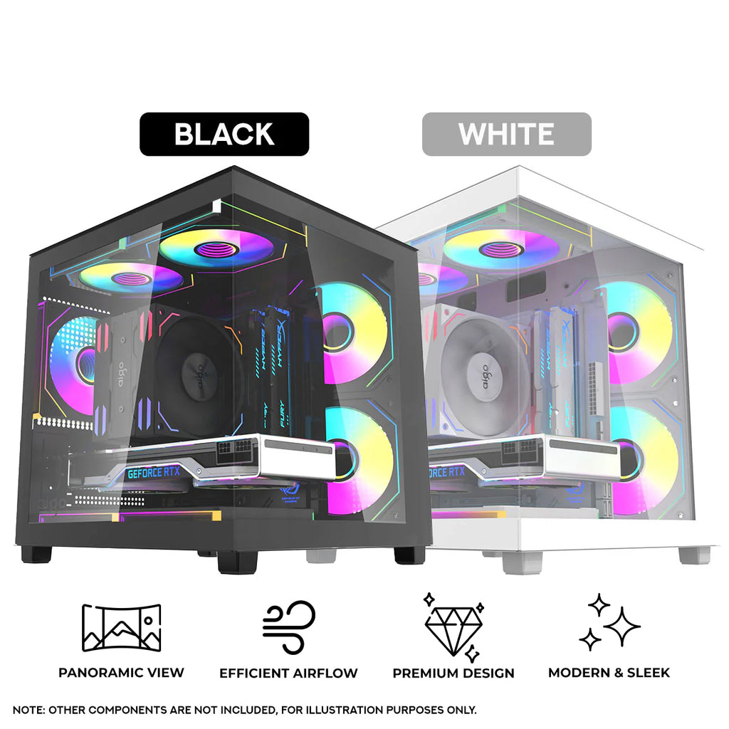 The Aigo Apollo A275 blends modern aesthetics with practical functionality. Its panoramic glass design provides a stunning full-view display of your components, turning your rig into a visual centerpiece. Optimized airflow ensures consistent cooling, while its compact M-ATX frame saves space without sacrificing performance. Perfect for gamers and creators, this case delivers both beauty and reliability in every build.