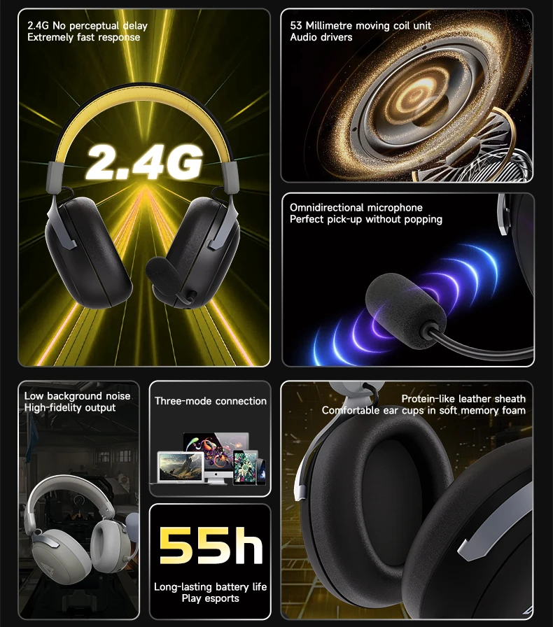 Experience superior gaming audio with the Ajazz AHM08 MAX Tri-mode Headphone featuring 53mm composite drivers, aluminum alloy construction, and versatile connectivity options. This professional gaming headset delivers exceptional sound quality across all your devices with up to 55 hours of wireless playtime.