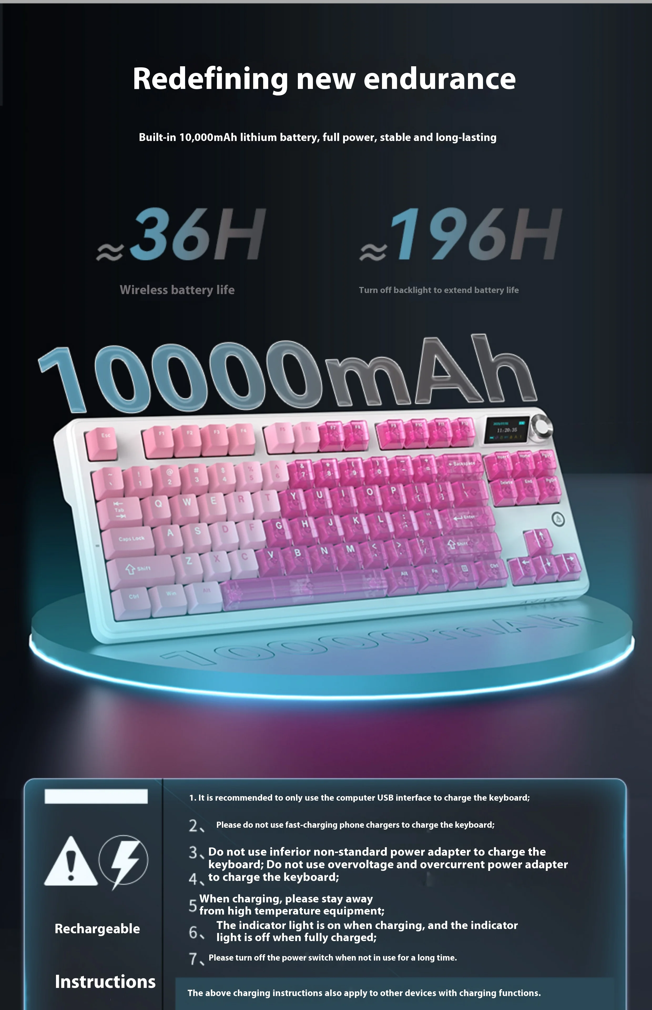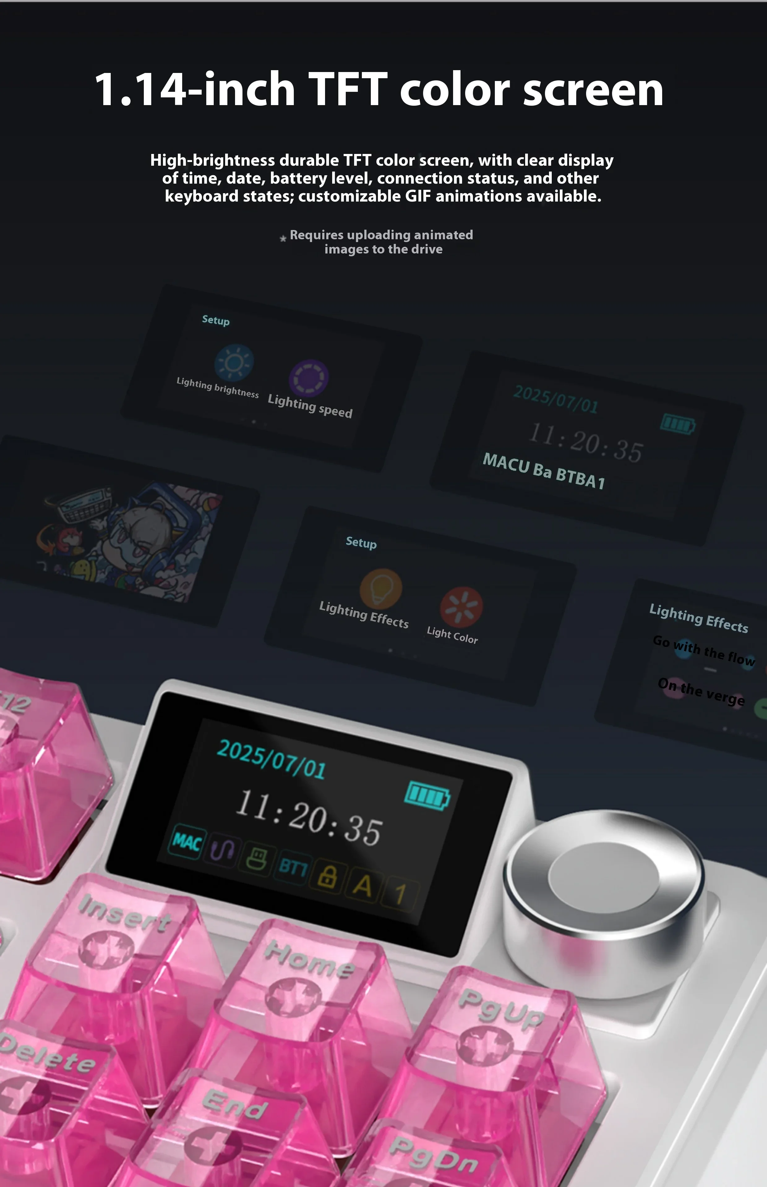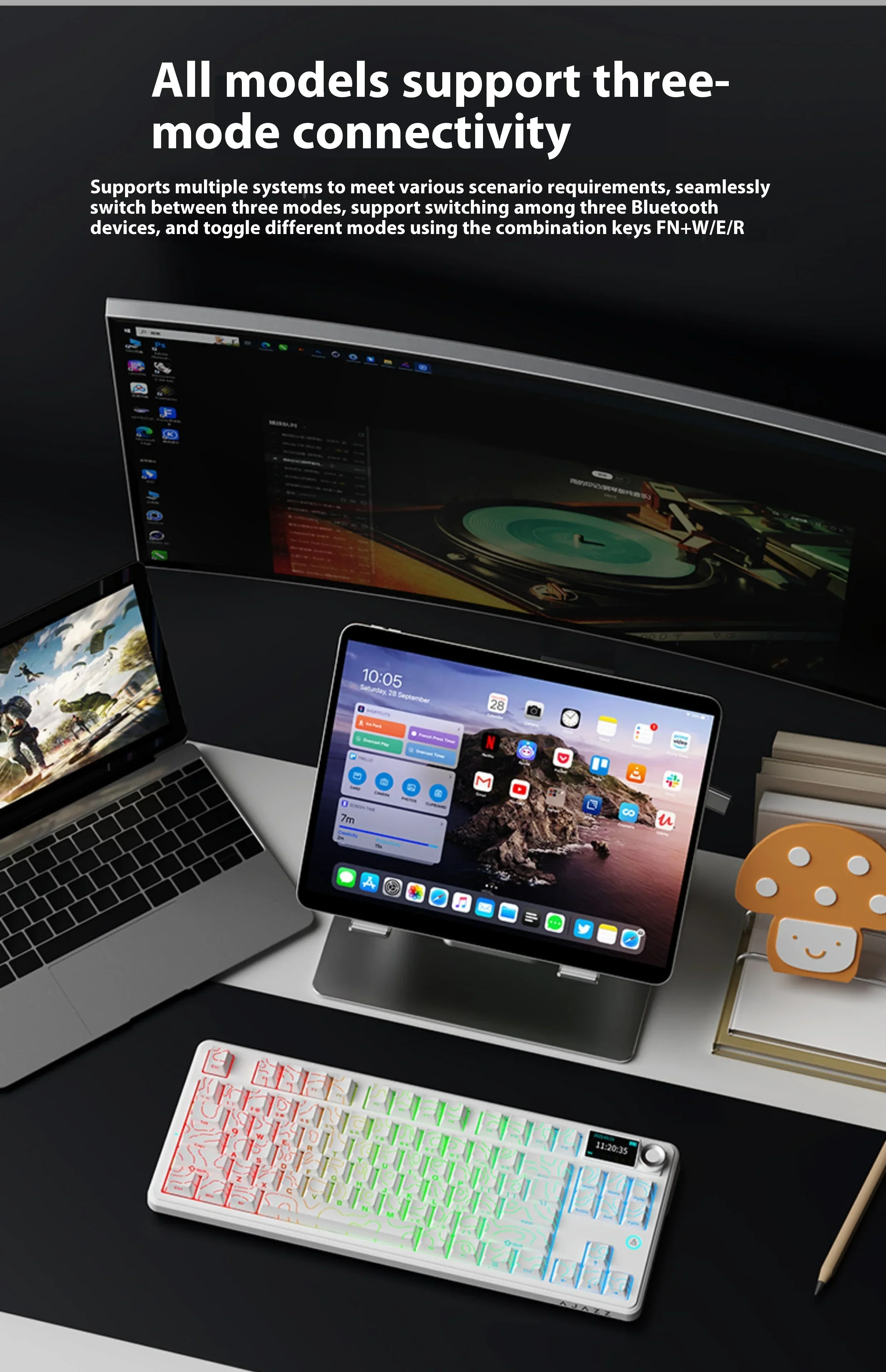 | Packing List | Keyboard ×1 Data cable ×1 2.4G receiver ×1 Manual ×1 2-in-1 switch puller ×1 Dust cover ×1 Free gift switches ×3 (Additional three keycaps included with screen version) |