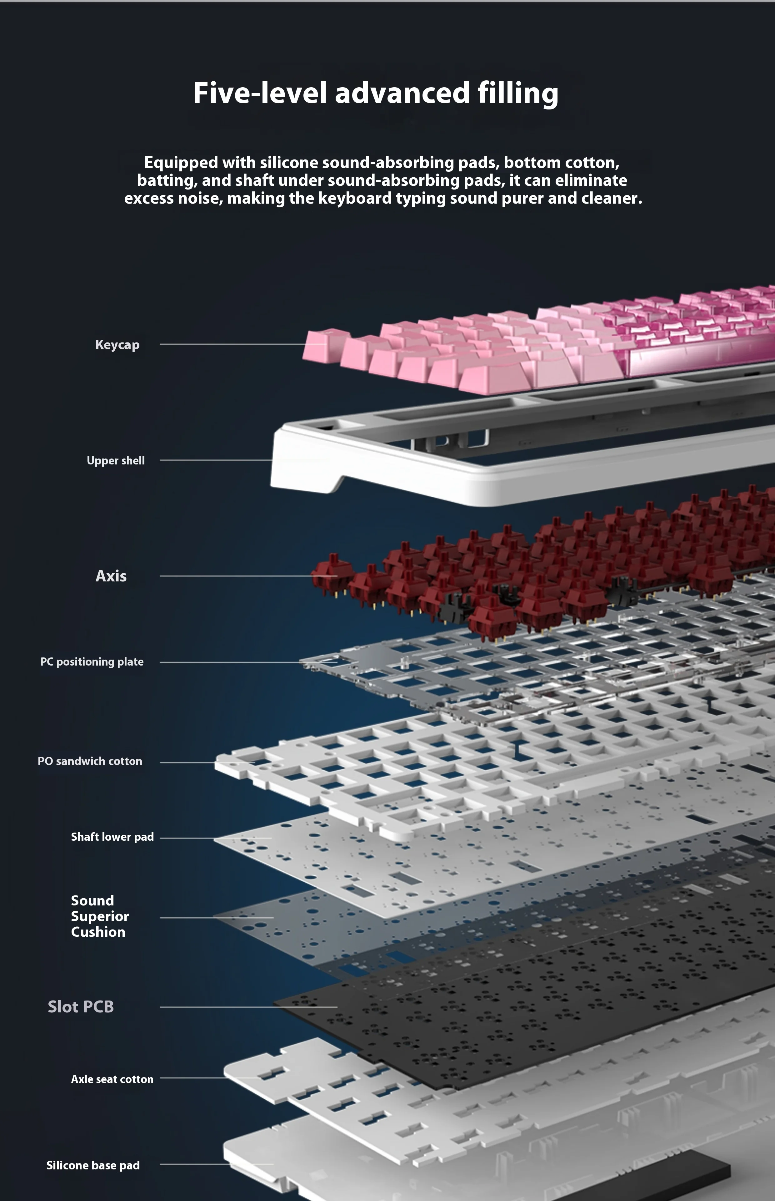 | Internal Fill | PO sandwich cotton fabric (10%) INPE foam switch bottom pad PET sound absorbing pad EPDM shaft seat cotton Ultra-thick silicone bottom pad |