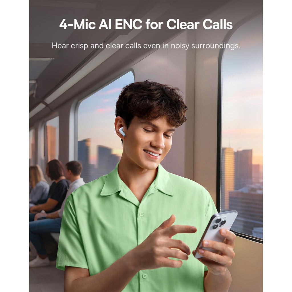 - 4-Mic AI Clear Calls: These Bluetooth earbuds feature 4-mic AI ENC technology that effectively isolates your pure voice from distractive background noise, ensuring your voice remains clear and crisp during every call whether you're in meetings, commuting, or outdoors in windy conditions