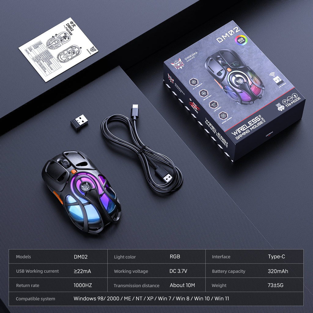ONIKUMA DM02 Tri-Mode RGB Gaming Mouse - Lightweight Honeycomb Shell, 1000Hz Polling Rate & 6-Level DPI Take control of every game with the Onikuma DM02. Its tri-mode design lets you switch between wireless, Bluetooth, or wired connection effortlessly. The ergonomic shape fits naturally in yo...