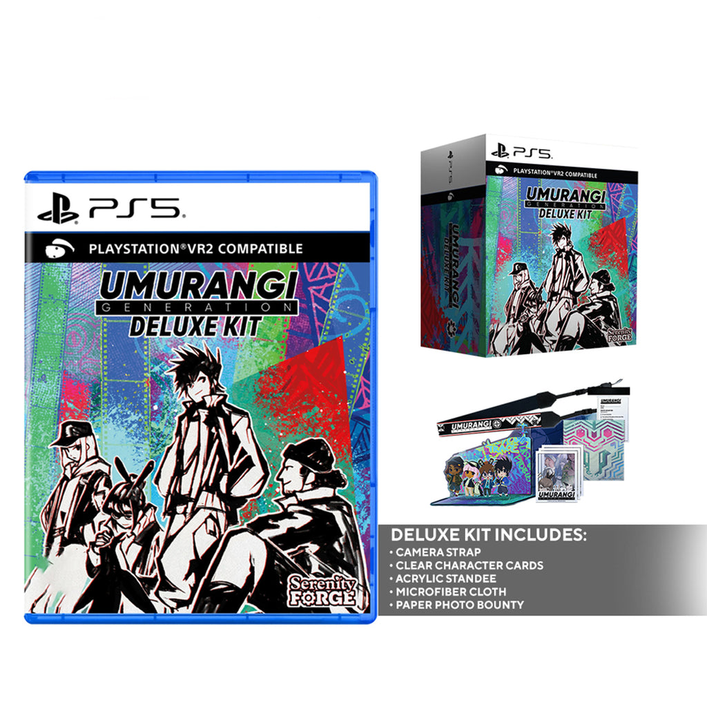 Each Umurangi Generation Deluxe Kit includes a physical copy of the game, illustrated inner cover sheet, Deluxe Kit outer box, camera strap, clear character cards, acrylic standee, microfiber cloth, and paper photo bounty.
