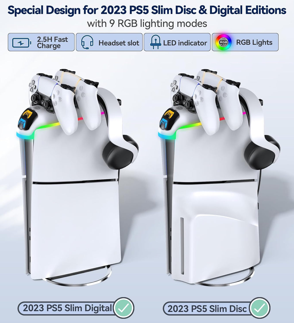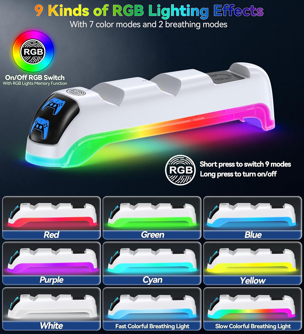 - RGB Ambient Light: PS5 controller charger placed on the top of the PS5 Slim console, simultaneously charging two PS5 controllers. There's an RGB light ring around the base of ps5 charging station, creating an immersive and relaxing atmosphere. The RGB offers 9 modes, including red, orange, yellow, green, cyan, blue, purple, fast flash, and slow flash. Easily switch light modes with a touch-sensitive button, and long-press to turn the light on or off. ps5 charger also features a memory function, automatically restoring the previous mode upon reopening.