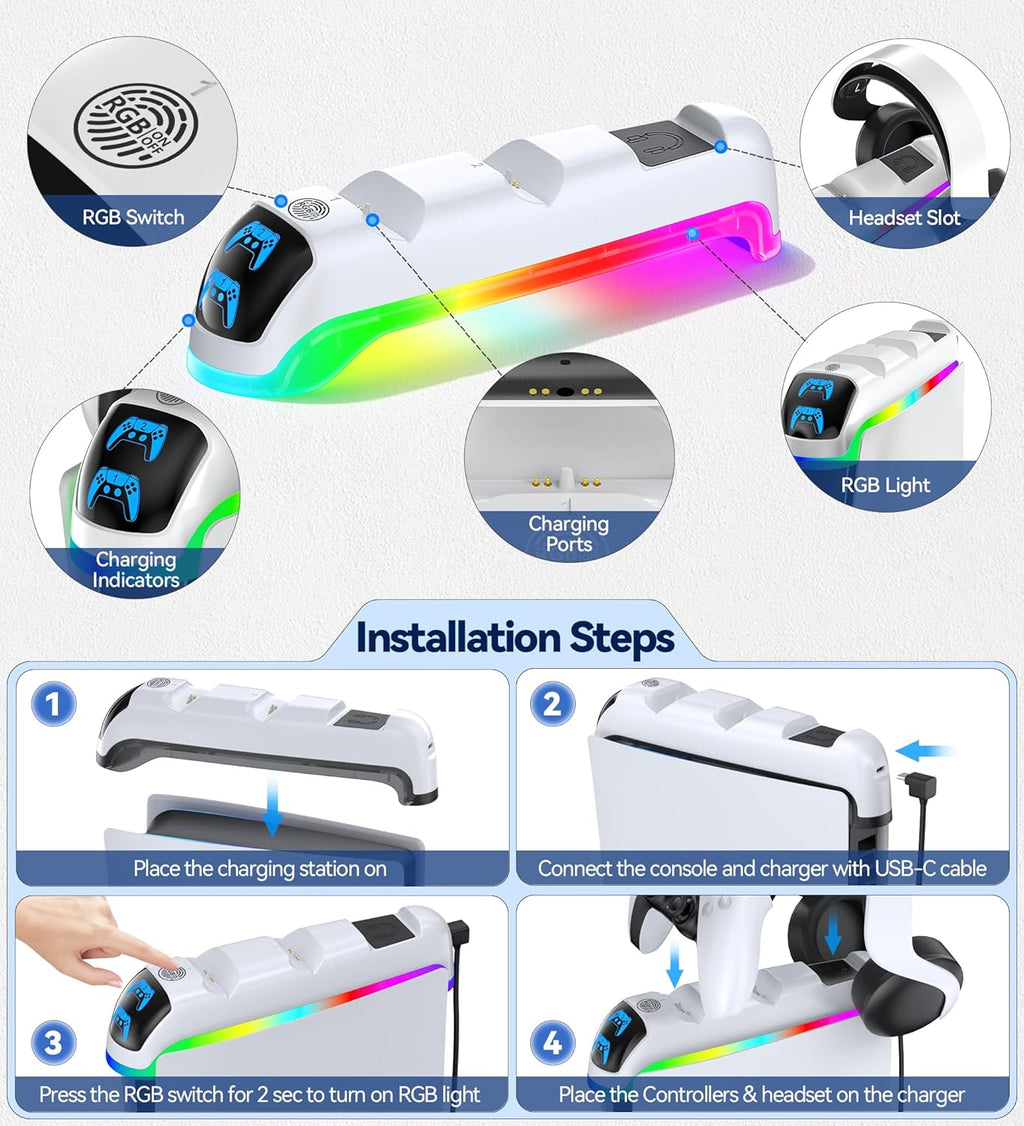 - Easy Installation and Use: PS5 controller charger station takes just 3 minutes for anyone to complete the installation. Firstly, place ps5 charger station on the PS5 Slim console, then use the included USB-C cable to power dualsense charging station. Long-press for about 2 seconds to activate the RGB lights. PS5 charging dock not only charges your PS5 controllers but also accommodates one PS5 headset. The icon on the front screen displays the controller's charging status, orange indicating charging, and blue indicating fully charged or standby mode.