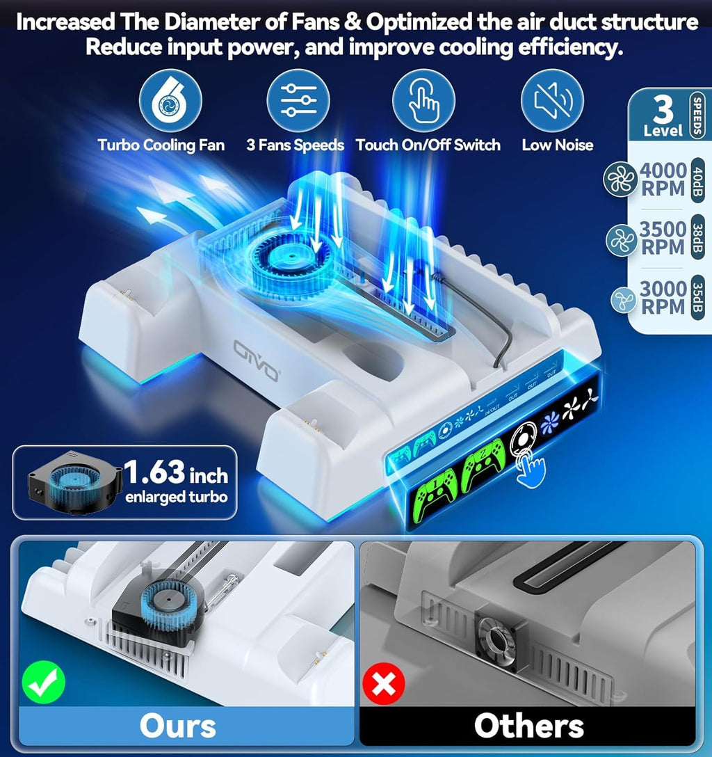 Upgrade your gaming setup with this PS5 Slim Cooling Station, featuring 4 built-in charging ports for charging multiple devices simultaneously. The enhanced 1.63-inch turbo fan improves cooling efficiency, drawing hot air from the bottom and dissipating heat in all directions. Equipped with a touch switch and a 3-level cooling fan, this vertical stand is the ideal accessory for any gamer.