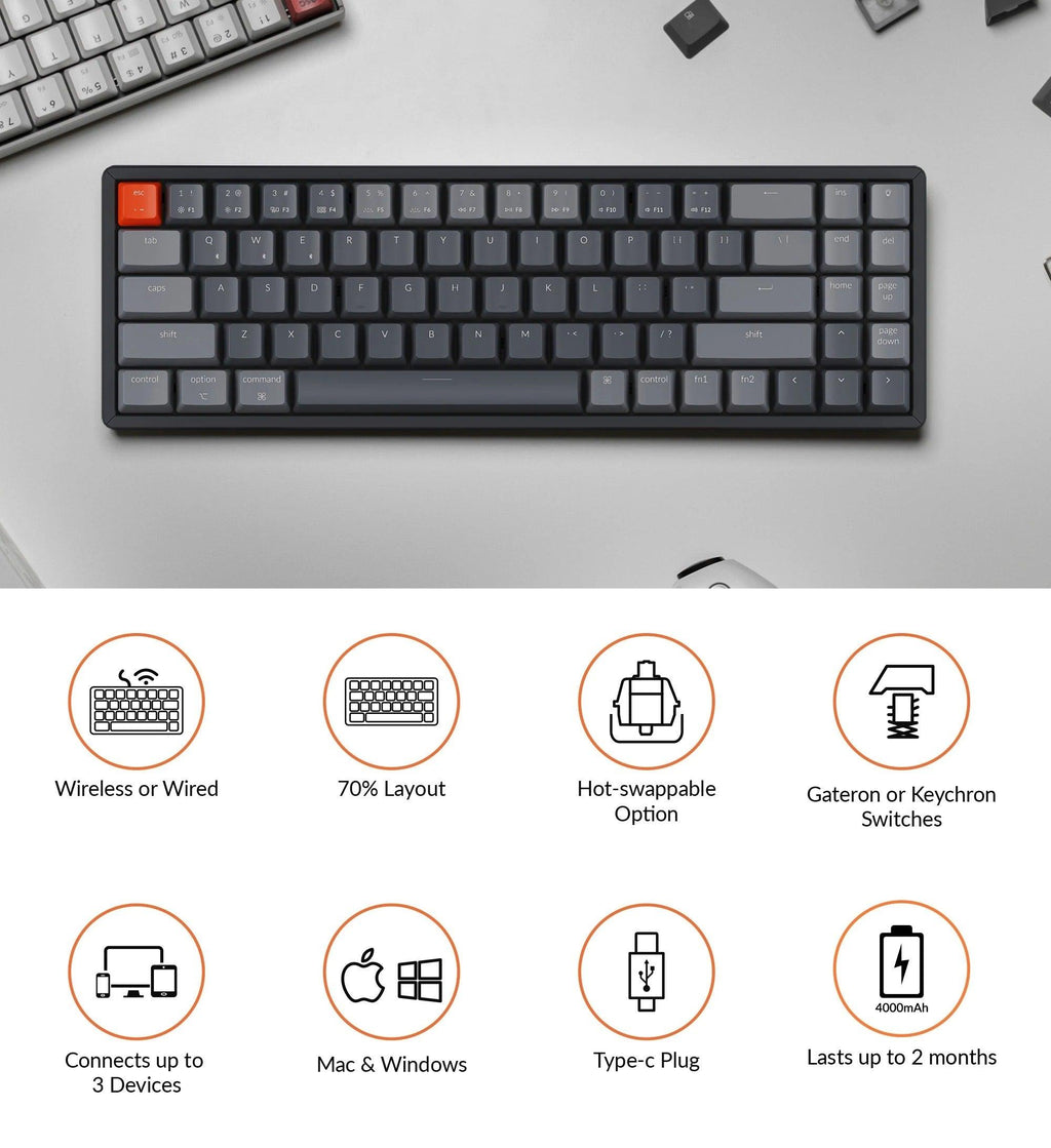Keychron K14 Wireless mechanical keyboard has included keycaps for both Windows and macOS, and users can hotswap every switch in seconds with the hot-swappable version, which is compatible with 3-pin and 5-pin MX style mechanical switches (Gateron, Cherry, Kailh etc.).