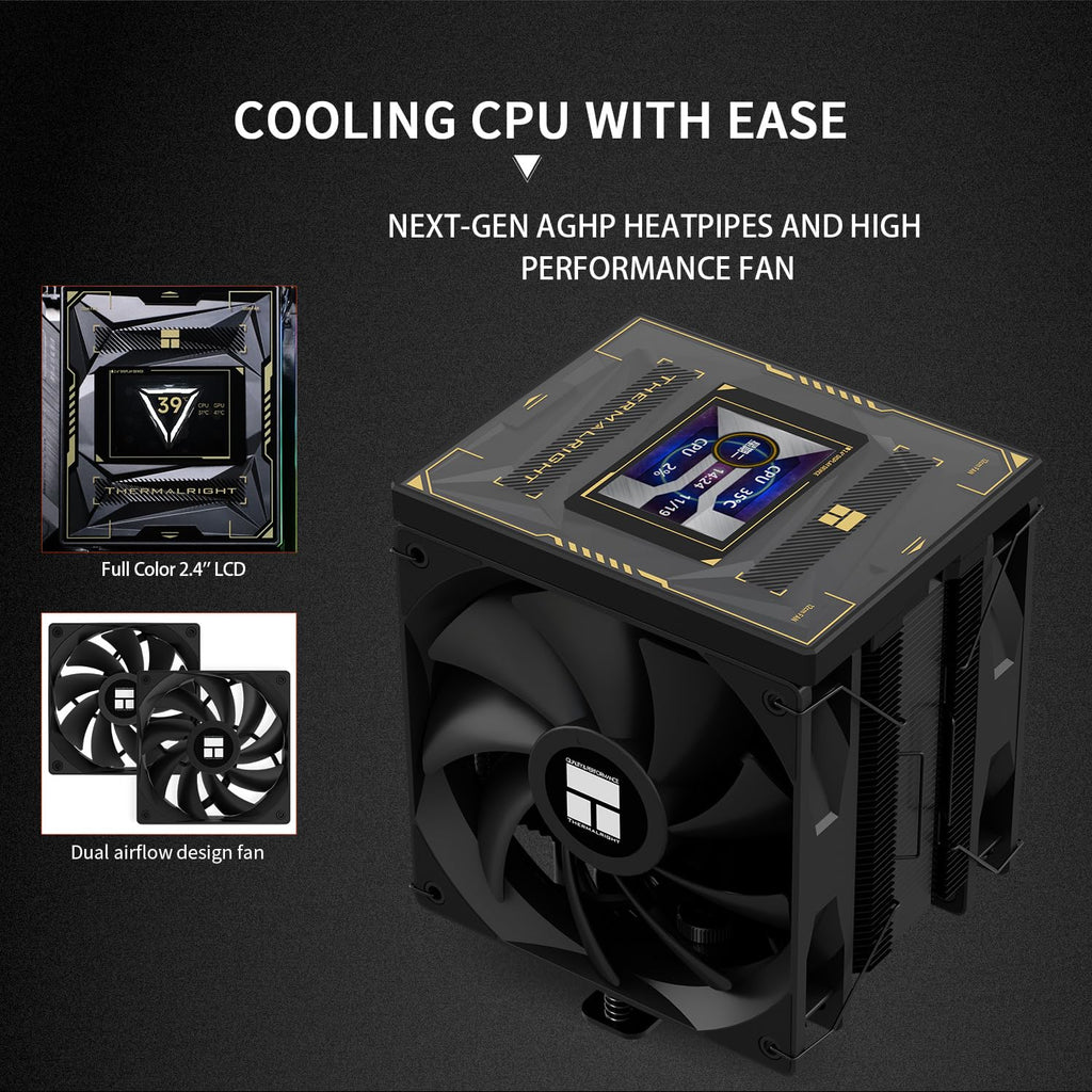 - [Excellent Cooling] The CPU cooler as a whole consists of a nano fully-painted black main tower and two 12cm CPU fans, a magnetic top cover with a 2.4-inch IPS LCD display, 6X6mm nano fully-painted black heatpipes, and the matching 1500RPM fan speeds can easily dissipate the CPU's temperature to make the cooler have excellent cooling efficiency.
