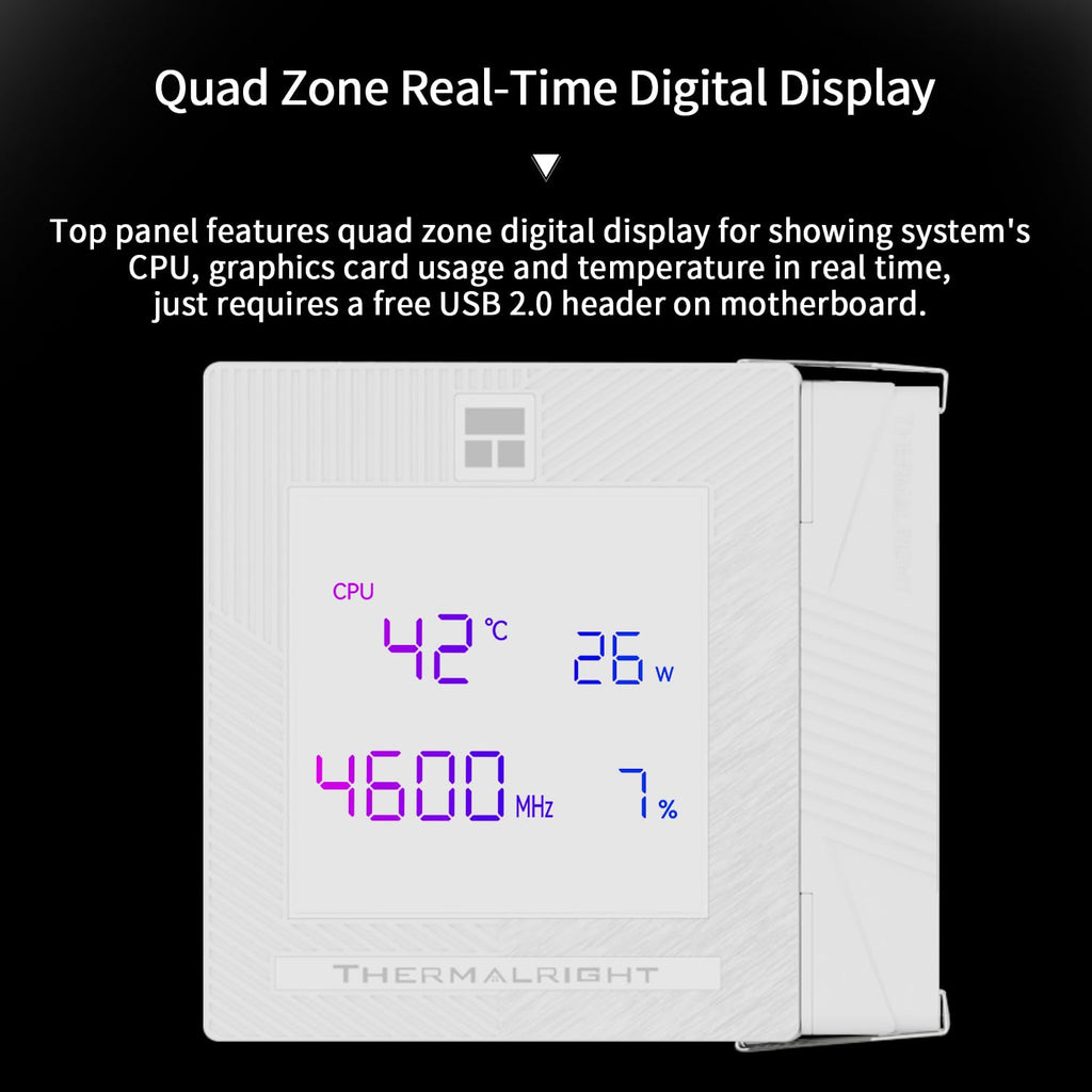 ARGB Magnetic Display Panel - The magnetic top cover ARGB display panel, paired with the radiator, can monitor the temperature and utilization rate information of the CPU and graphics card. Combined with the TRCC control software, it enables monitoring of computer data