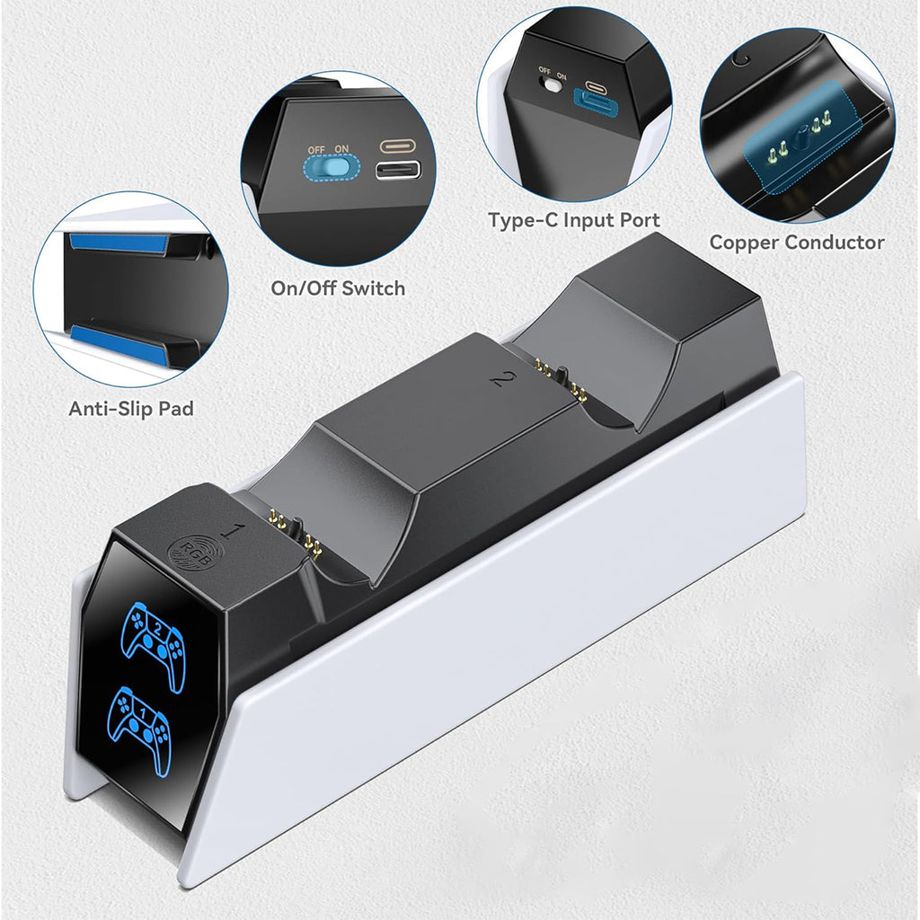 Compatible with PS5 & PS5 Edge Controllers: This charger station is designed specifically for dual PS5 controllers, using a dedicated AC power adapter for simultaneous charging. It's an essential accessory that keeps you gaming longer with your PlayStation 5. This PS5 charging kit is the perfect alternative to the official OEM DualSense wireless controller charging station.