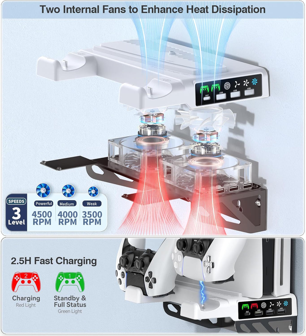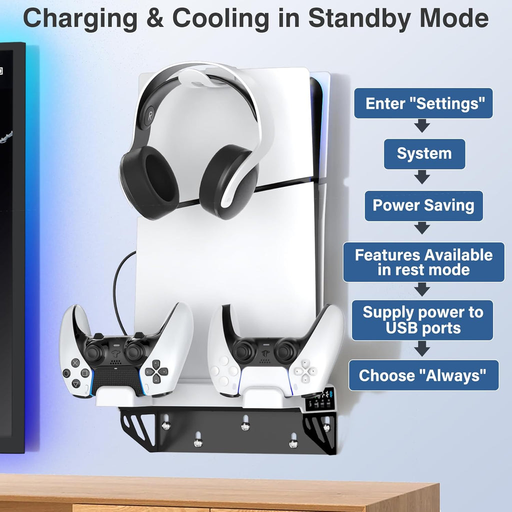 - Two Internal Cooling Fans - With built-in cooling fans, PS5 cooling station provieds better heat dissipation which can prolong the life of PS5/PS5 slim/PS5 Pro console. You can adjust fan speeds depending on your needs, repectively high, medium, low and close. Keep charging & cooling in standby mode (Enter "setting"-system-power saving-features available in rest mode-supply power to USB ports-choose "Alway" ). Moreover, the hollow design of wall mount is able to provide all-round heat dissipation.