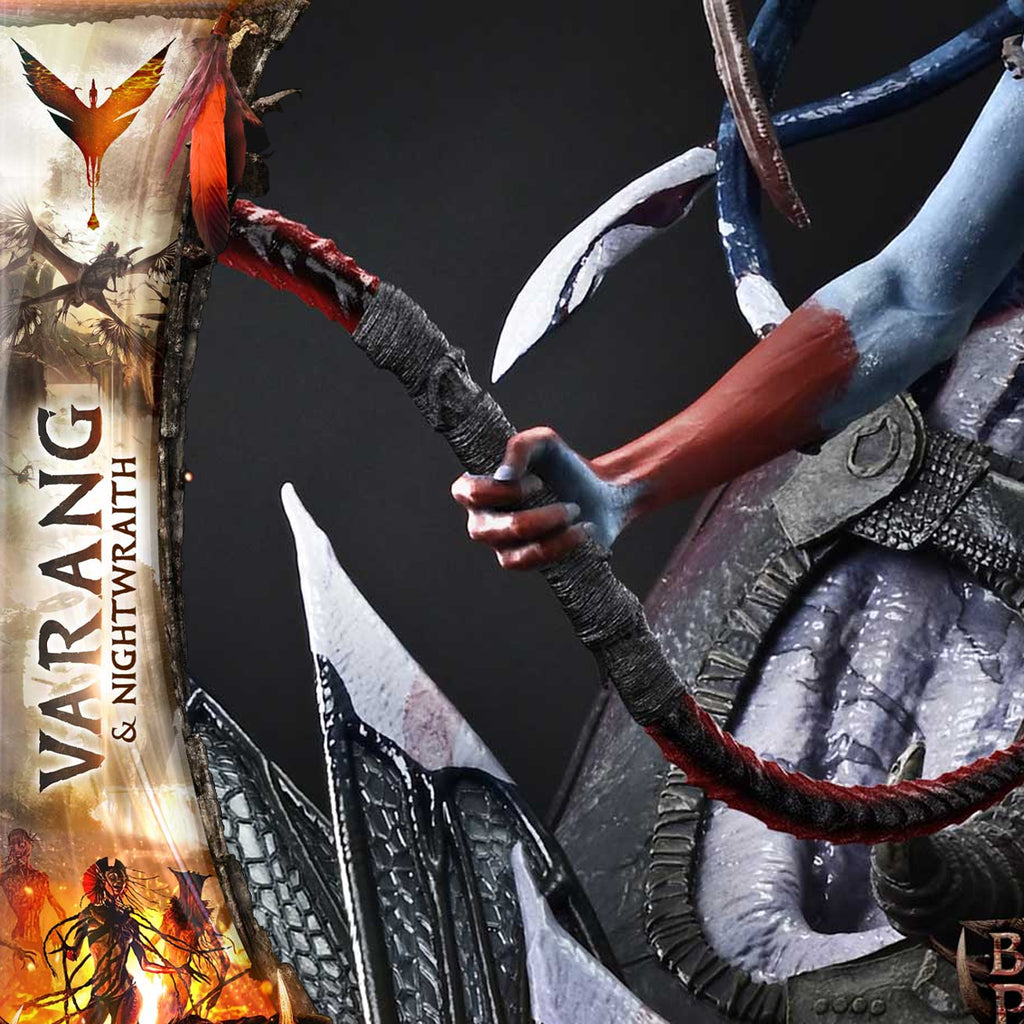 Nightwraith, ever at her side as if to protect her, is also sculpted in fierce, high-detail form. Its massive horned head is rendered in realistic detail down to the interior of its fanged maw. Even the saddle at its neck is expressed with rich materiality, from leather texture to signs of age.