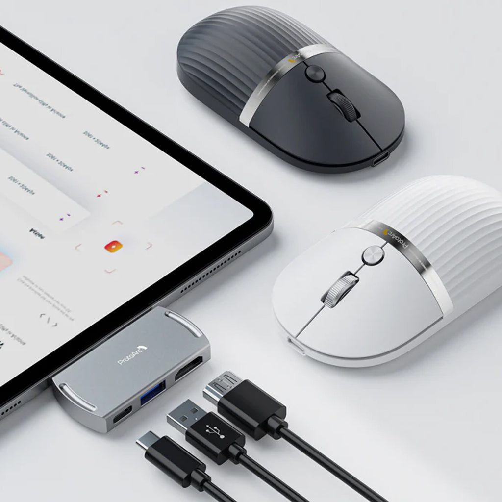 ProtoArc HubMouse is not just a hub but also a high-performing mouse. The HUB itself is a Plug and Play 2.4G wireless receiver, and the mouse has two additional Bluetooth channels that allow multi-device connection at once.Seamlessly switch between your MacBook, iPad, iPhone, and other devices.