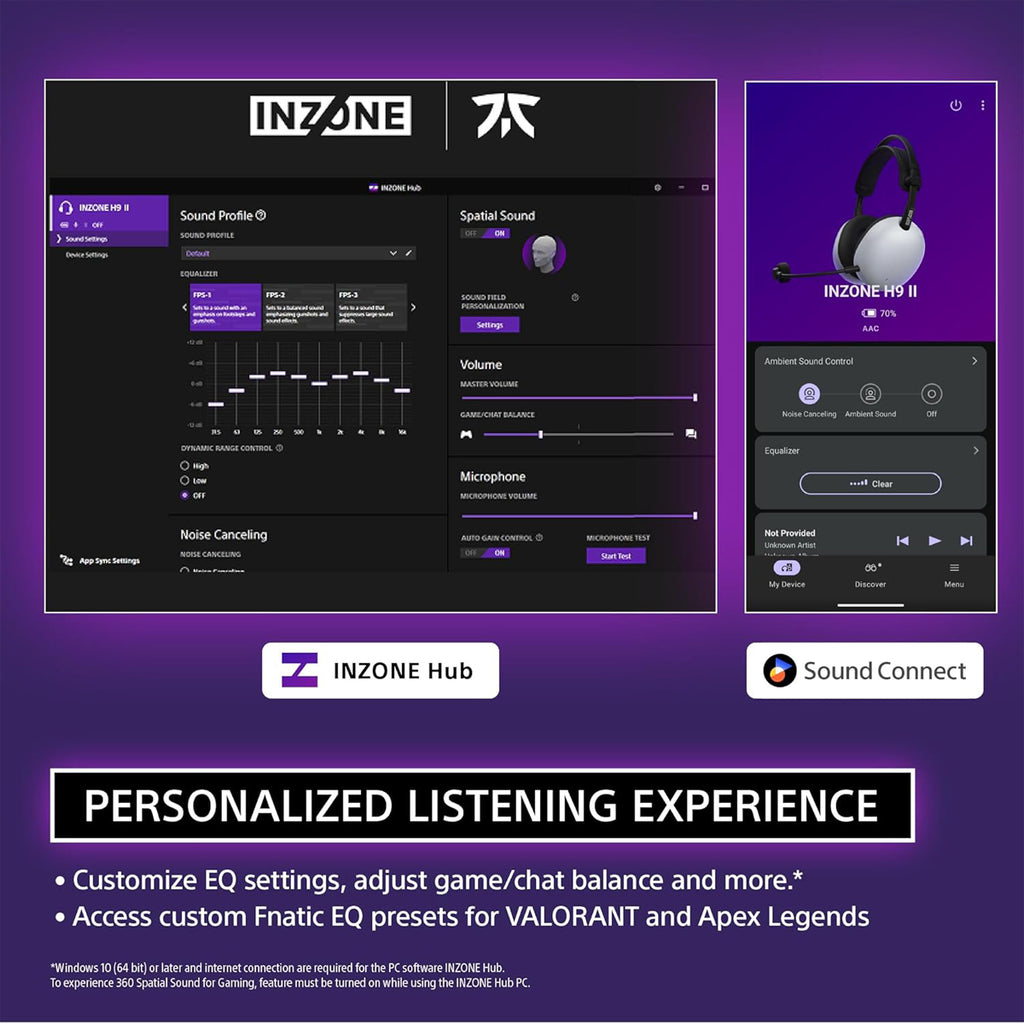 ![]() Intuitive EQ with INZONE Hub and Sound Connect appSet game-specific EQ presets with the INZONE Hub for PC. For PlayStation 5, adjust manually via the Sound Connect mobile app. |