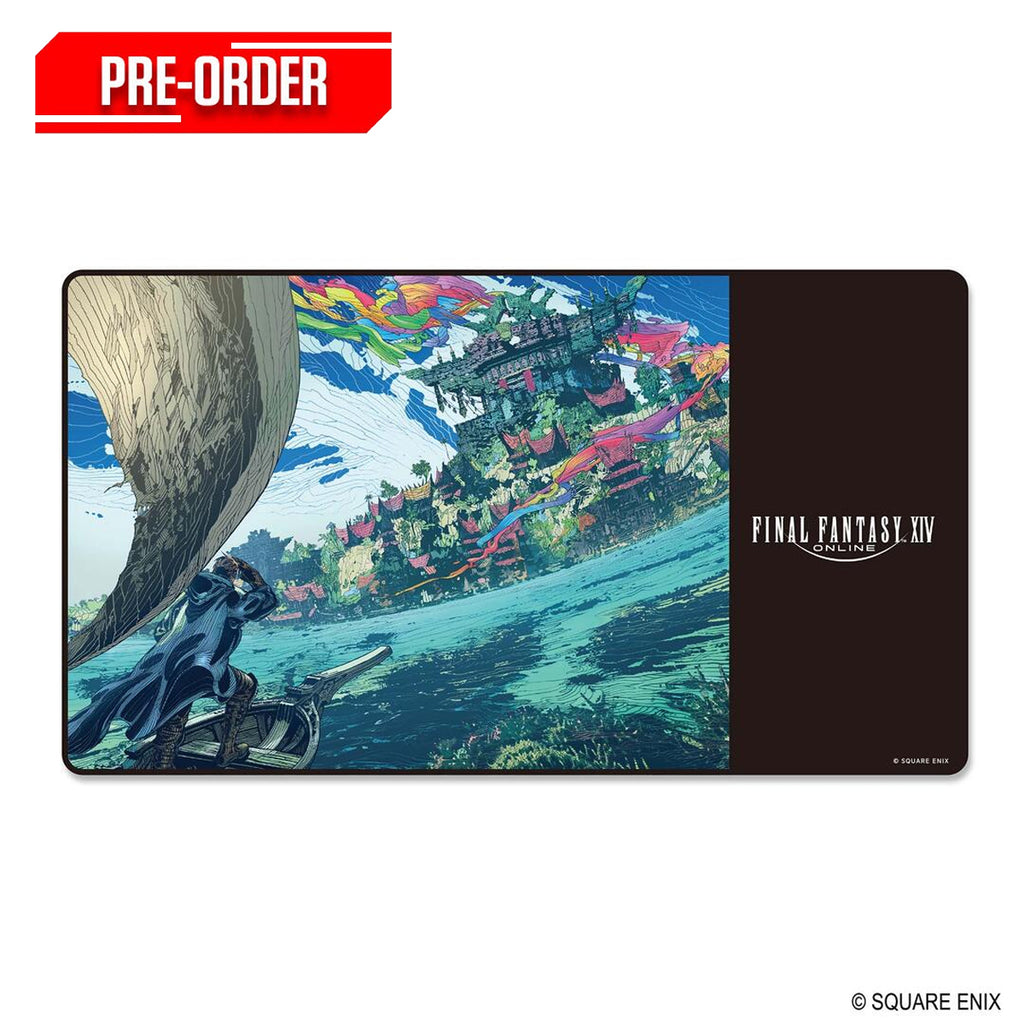 Featuring image artwork from Final Fantasy XIV, this playmat is designed for use during card game play and tabletop activities. It can also be used as a mouse pad for desk setups. The mat measures approximately 610 mm in width and 340 mm in height, with a thickness of about 1.5 mm, providing a compact and practical play surface. Made from polyester, it offers a smooth texture suitable for cards and mouse movement.