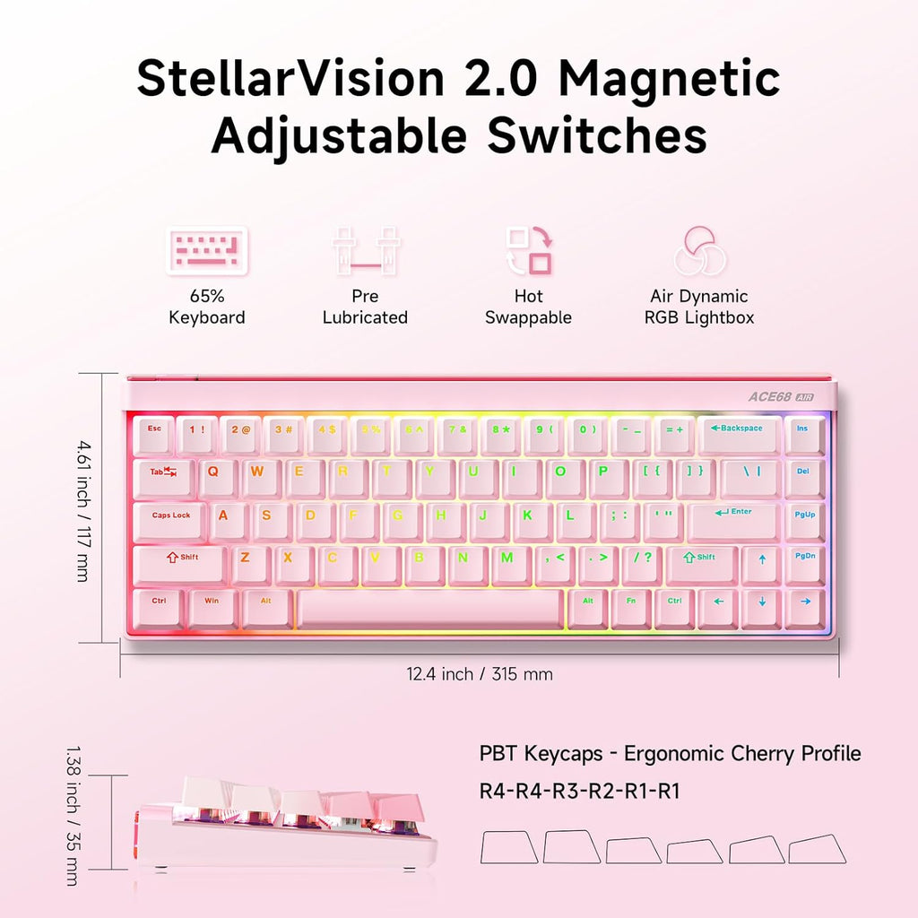 MCHOSE Ace 68 Air Hall Effect Magnetic Switch Gaming Keyboard Note: Other keyboards are for illustration purposes only.   Specification: Model Ace 68 Air (Esports) Switches Fire Shadow Switch Keycaps Cherry-profile PBT Keycaps Features Air Dynamic RGB Lightbox, GIF Lighting Effects, Ful...