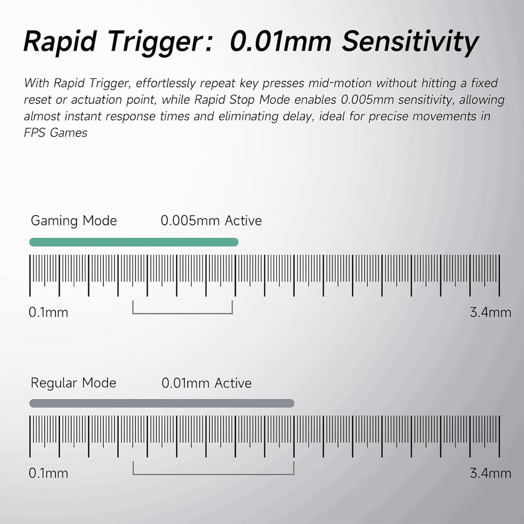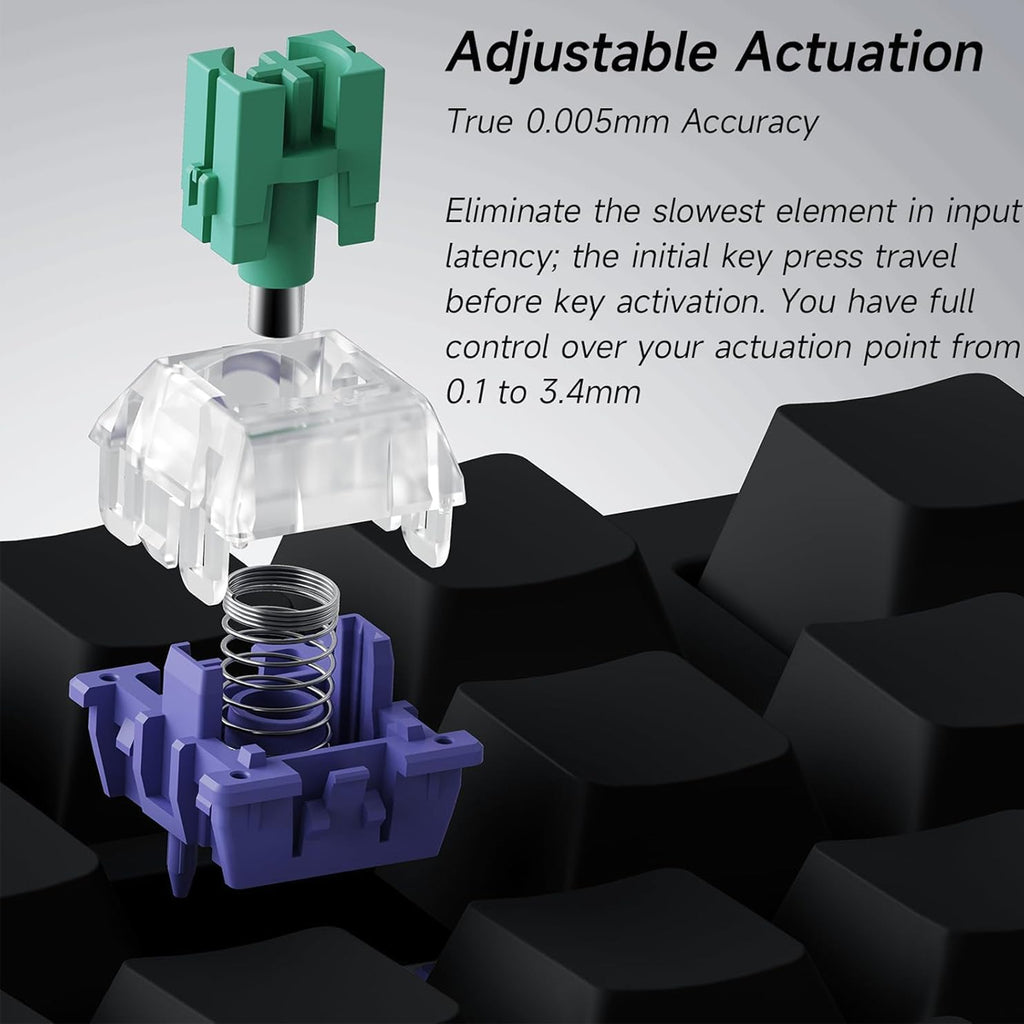 With Rappy Snappy (SOCD resolution), the keyboard intelligently prioritizes directional inputs, giving you a competitive edge in counter-strafing, bunny hopping, and combat timing. Fully adjustable actuation from 0.1 to 4.0mm lets you fine-tune every keystroke to your playstyle.