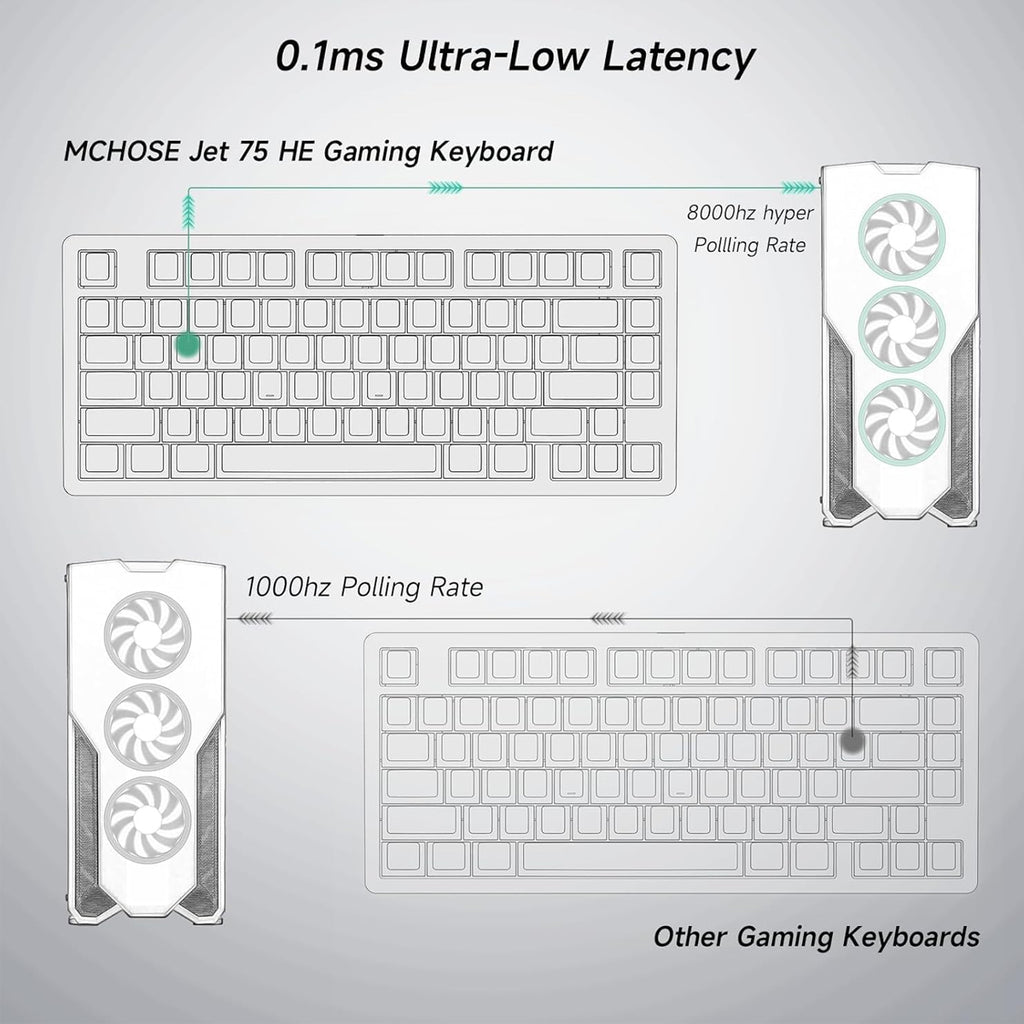Experience elite esports performance with the MCHOSE JET 75, engineered for players who demand extreme speed and precision. Featuring true 0.1ms ultra-low latency, an 8000Hz polling rate, and a 128K scan rate, this keyboard is powered by a custom high-frequency esports-grade chip and Algorithm 2.0 for lightning-fast, ultra-accurate input.
