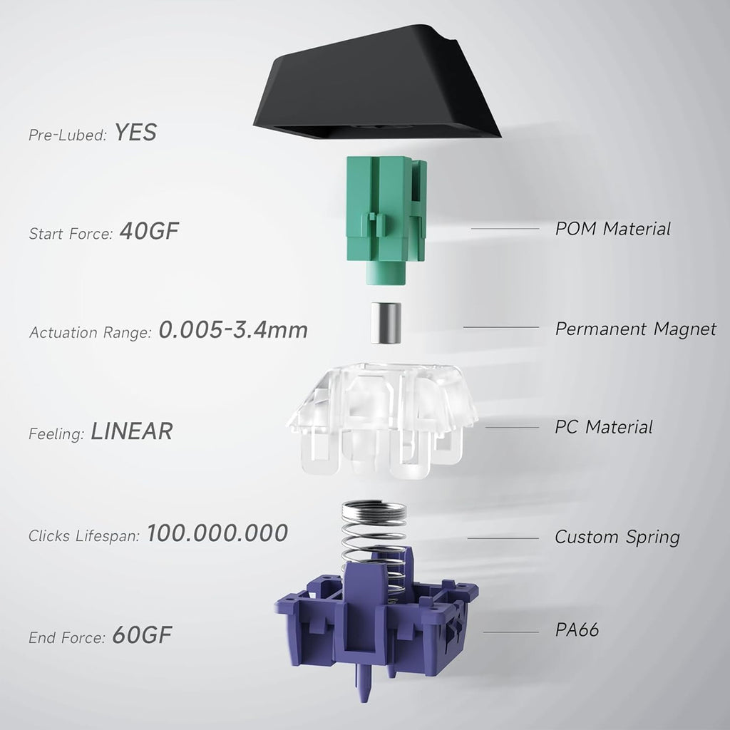 The floating keycap design adds a sleek, modern look while making cleaning effortless. Advanced customization options—including dynamic key travel, key macros, SOCD, RS, DKS, MT, and TGL—ensure faster, smoother, and more responsive FPS performance.