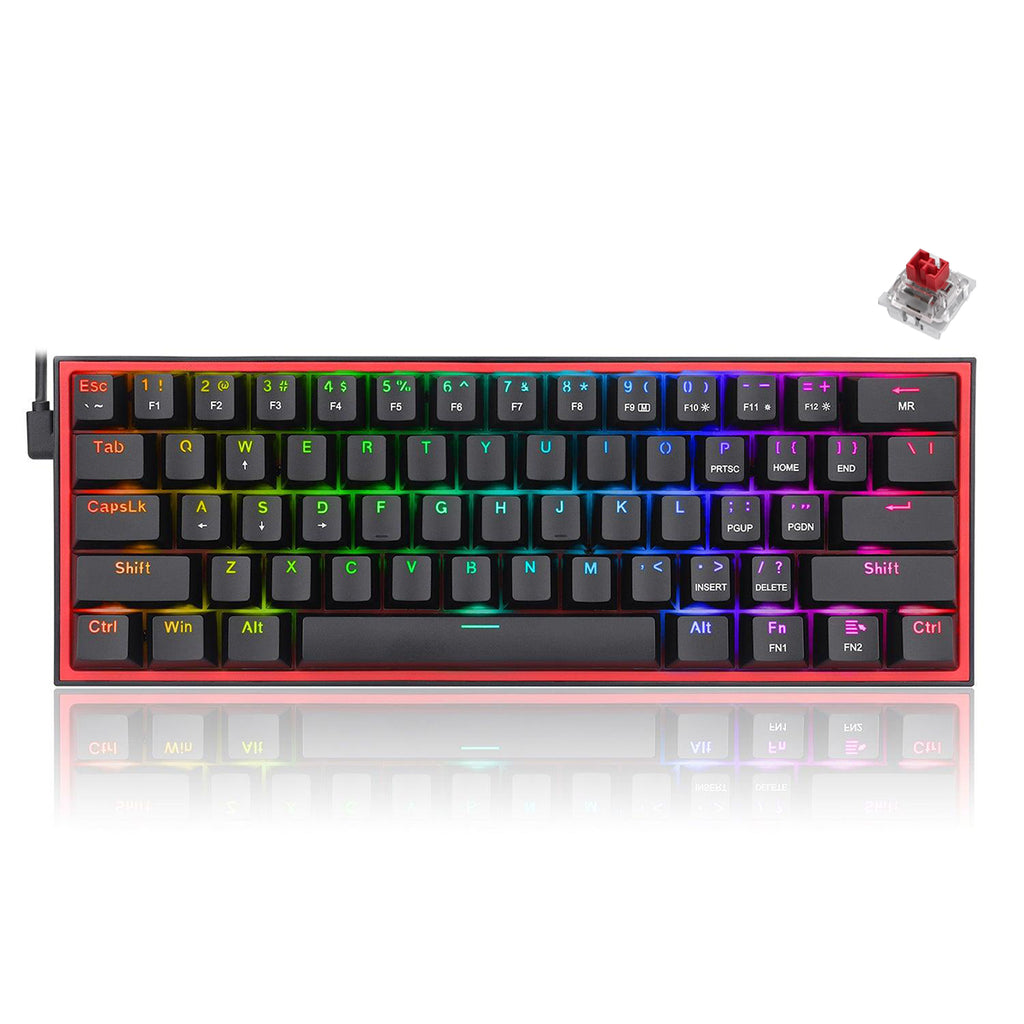60% Wired & 2 Colors Keycaps: Redragon 60% keyboard in wired mode with fresh 2 colors mixed keycaps layout. Ultra-compact 61 keys with novel keycap color frees up precious desk space with vibrant elements.